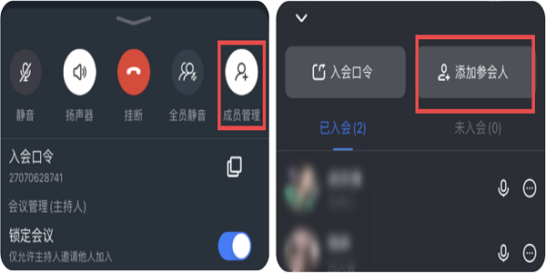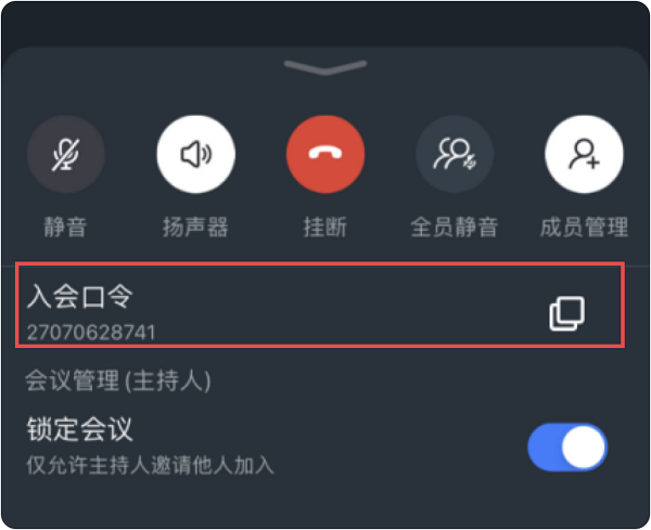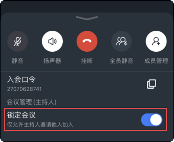 视频的发起人(即主持人)能够通过设置“锁定会议”的权限,来把控是否允许其他参与者邀请他人加入当前会议。