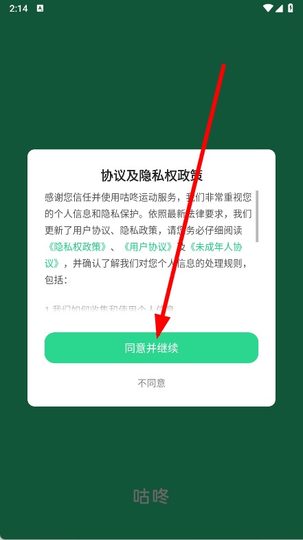1、打开咕咚,在弹窗中点击同意并继续。