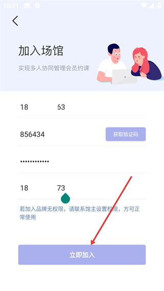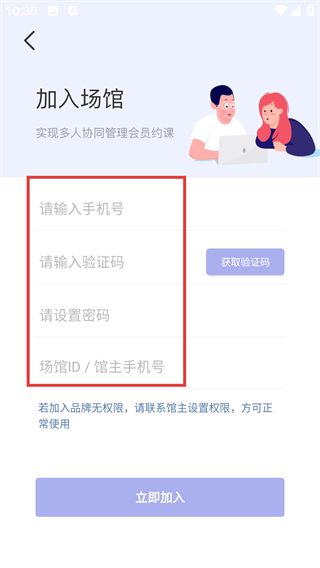 3在进入场馆添加页面时,需依次填写联系电话、验证信息、登录密码以及对应的场馆标识或馆主的联系电话。