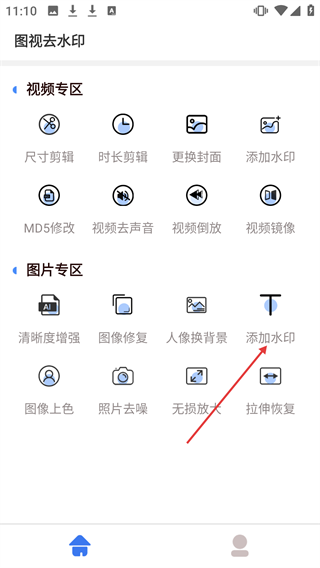 1在图视去水印应用的功能界面中,定位到“图片专区”板块下的“添加水印”选项,点击该选项即可开启水印添加的操作步骤。