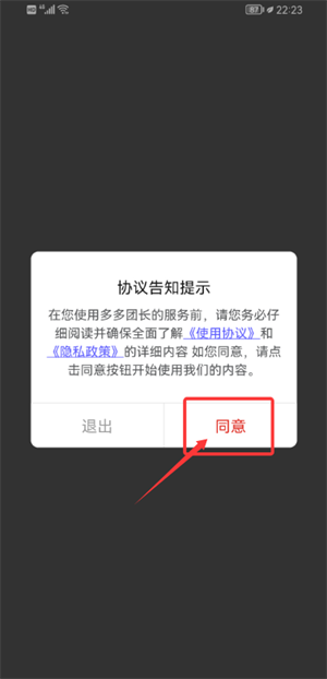 1、打开多多团长应用,仔细阅读使用协议和隐私政策,点击同意后进入应用。