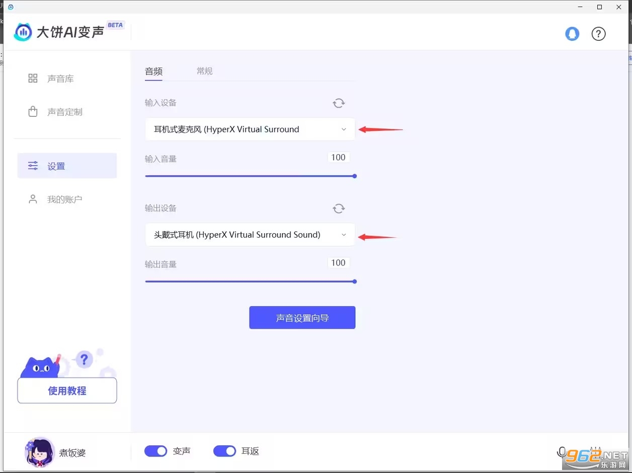 在大饼AI变声器里,把输入设备和输出设备分别设置成耳机麦克风与耳机扬声器。
