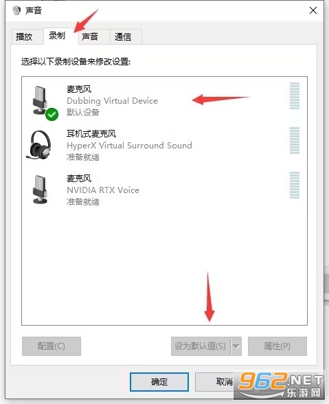 选择“录制”选项,接着选中“Dubbing Virtual Device(大饼AI变声器虚拟声卡)”,并将该设备设置为默认值。
