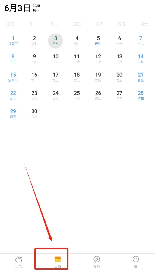 2在软件界面里找到日历的入口,点击一下,就能看到日期、节假日这些和日历有关的信息。