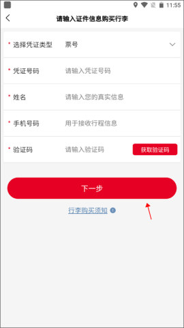 2、选择“行李”服务,便捷输入证件信息,畅享无缝在线购票体验。