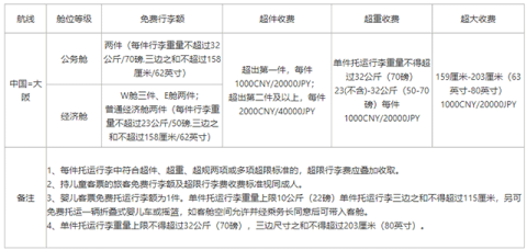 公务舱可携带两件行李,每件行李的重量限制为不超过32公斤;经济舱无论何种情况均为两件行李,每件行李的最高重量为23公斤。