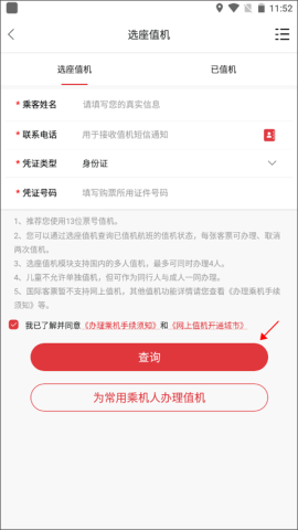 2、填写乘客信息,勾选相关条款后,点击查询,选择心仪座位,轻松完成操作。