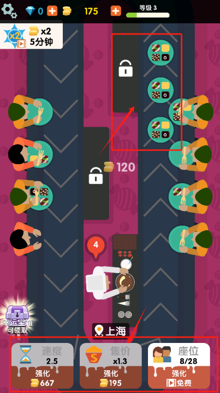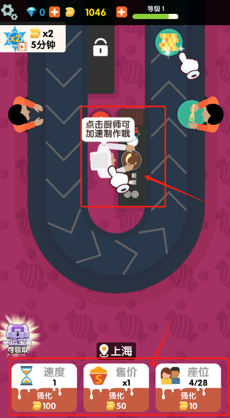 1、点厨师加速做菜,攒够100金币先升级速度,座位还能坐4个人。