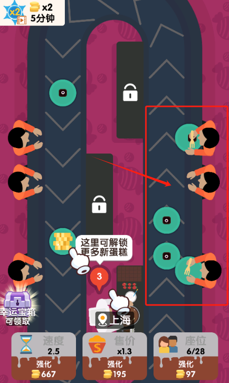 3、免费点座位加到8个,等攒够195金币再升级售价到1.3倍。