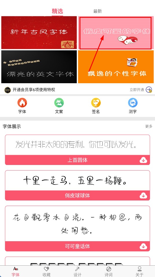 1在首页能够选择不同风格的字体分类,例如点击【俏皮可爱的字体-分类标签】,即可进入可爱字体页面。