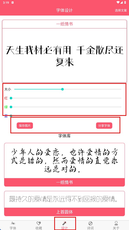 3在界面底部找到“设计”相关选项,点击其中的功能按钮入口,就能进入字体样式的设置界面。在这里可以对字体的尺寸、色彩等参数进行调整,完成设置后还能将当前效果保存为图片,或者把设计好的字体样式分享出去。