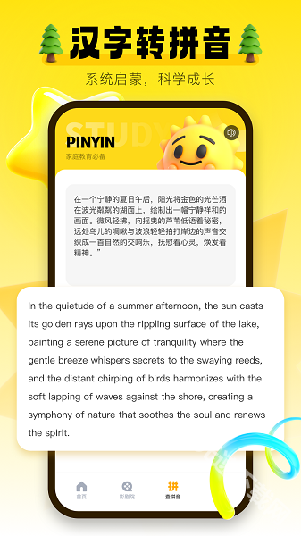 这款汉语拼音启蒙工具设计得十分贴心,既简单易用又富有实用价值。它借助生动的动画短片和互动游戏,把枯燥的知识转化为趣味体验,能有效激发孩子的学习热情,让他们在轻松愉快的氛围中完成启蒙阶段的学习任务,自然而然地对学习产生好感。