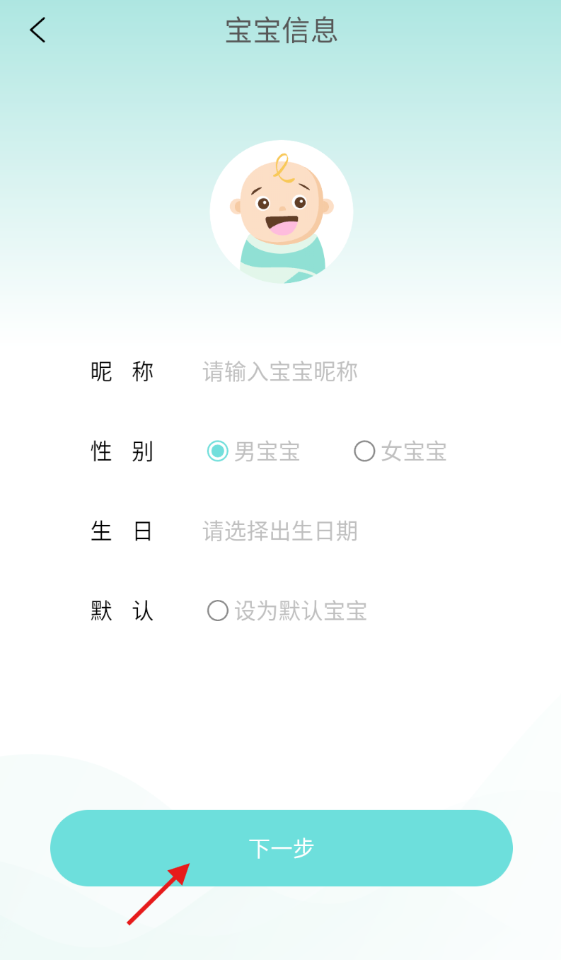 3、按顺序填写宝宝的昵称、性别、出生日期等相关信息,之后点击“下一步”按钮,即可完成创建操作。