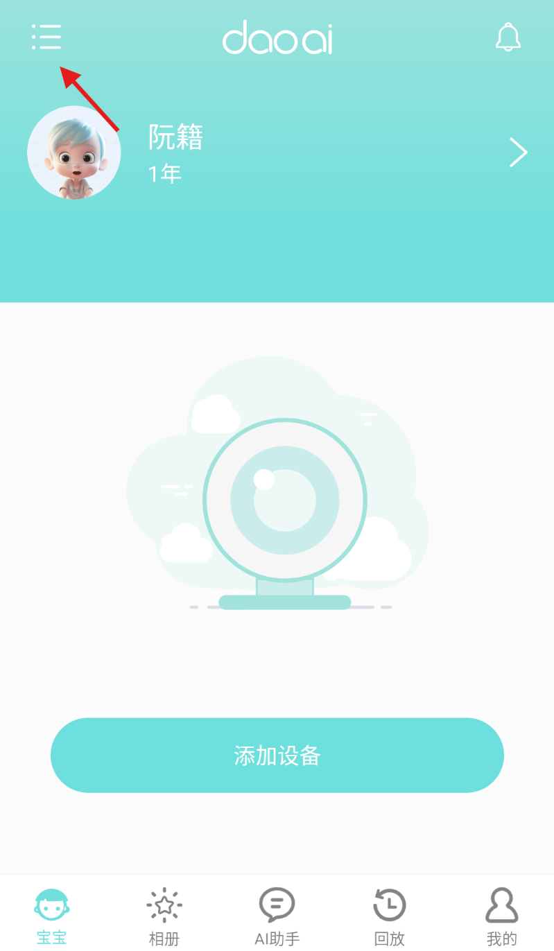 1、启动道爱家庭软件,进入宝宝管理页面后,点击左上角的扩展图标。