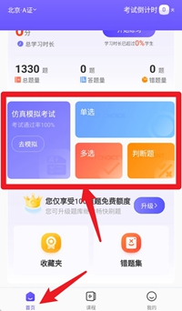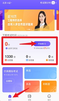 1、点击首页的“开始练习”按钮,就能马上进入题库练习界面,累计答题时长会自动进行记录。