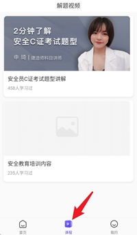 3点击底部导航栏里的“课程”选项,就能观看考试相关的讲解视频,助力掌握考试中的重点题型。