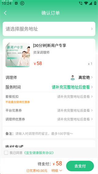 3. 第三步,填写服务地址,选定服务时间,点击去支付按钮,之后静候理疗师上门服务即可。