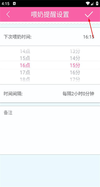 2、进入喂奶提醒设置页面后,设定好下次喂奶的具体时间以及时间间隔,点击保存按钮,即可完成喂奶提醒的相关设置。