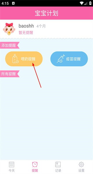 1打开软件后进入提醒页面,由于宝宝目前4个月暂无提醒内容,可点击喂奶提醒选项进入对应的设置页面。