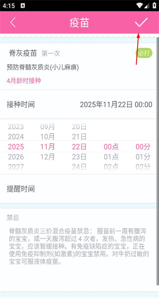 4、在疫苗详情页面,可设置接种时间等相关信息,完成疫苗提醒的配置,该界面操作简便直观。