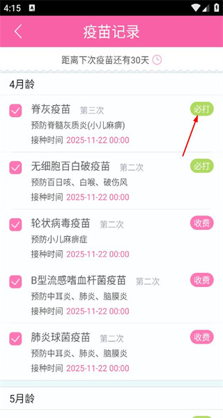3打开疫苗记录界面后,能看到标注着“必打”或“收费”的4月龄脊灰疫苗等项目,点击对应疫苗即可查看具体信息。
