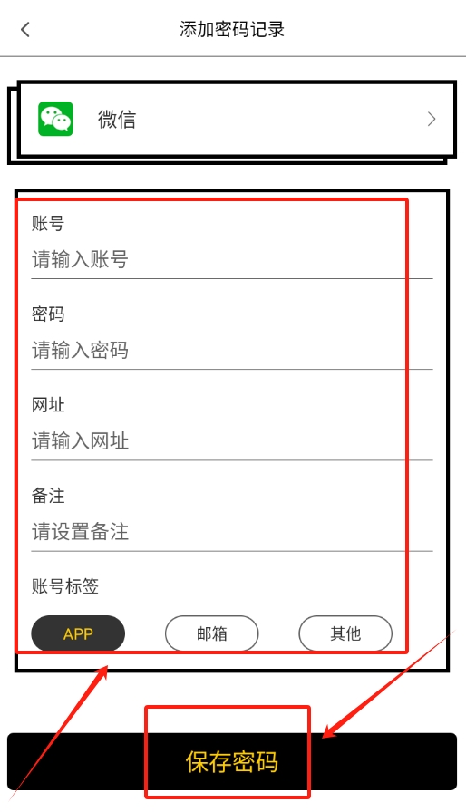 2找到“添加记录”的入口并点击,接着填写账号、密码等相关信息,系统会自动将这些内容按类别保存,同时还能与其他账户建立关联。