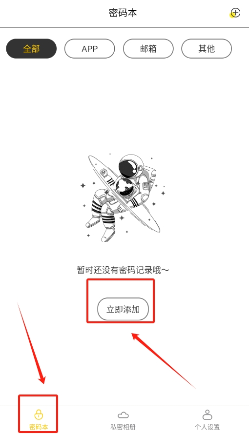 1、启动密码记录本软件,在首页找到“添加密码”按钮,点击该按钮进入添加页面。
