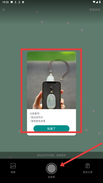 4拍摄翡翠时,既可以从相册中选取已有的图片上传,也可以直接点击拍摄按钮现场拍摄翡翠。