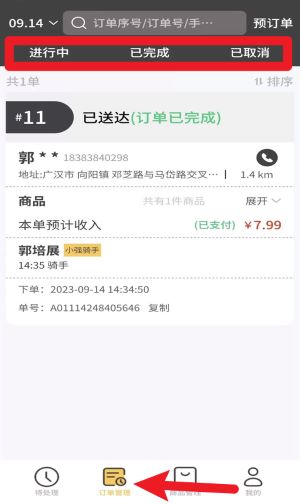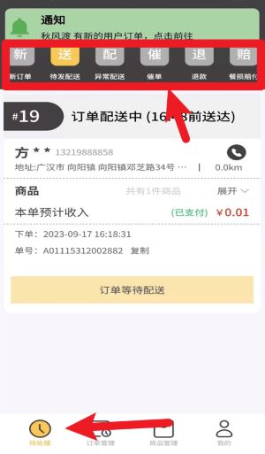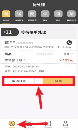 2进入订单管理页面后,选择“待处理”分类标签,就能看到所有尚未接单以及正在配送过程中的订单具体信息。