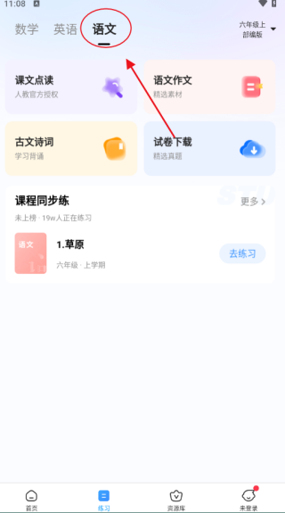 3、点击“练习”栏目,选择“语文”,再选择“语文作文”功能。