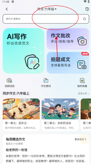 4、进入六年级作文栏目后,相关信息会清晰呈现,能让您在此进行写作、作文批改以及拍题成文等操作更加便捷。