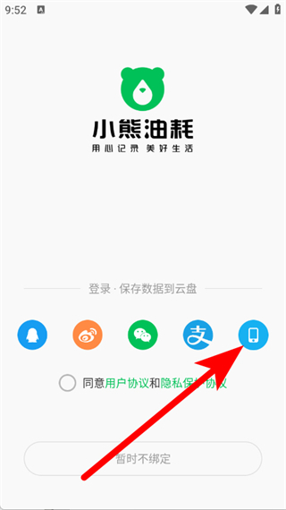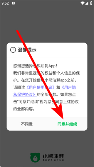 1、启动小熊油耗应用,在弹出的窗口中点击“同意并继续”按钮,随后进入登录方式的选择界面。