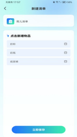 4、进入新建清单板块后,能够查询育儿清单,无论何时点击新增物品,操作都十分便捷省心。
