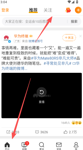 1启动微博极速鸿蒙版应用后,找到界面右上角的加号图标,点击它就能展开发布微博的功能入口。