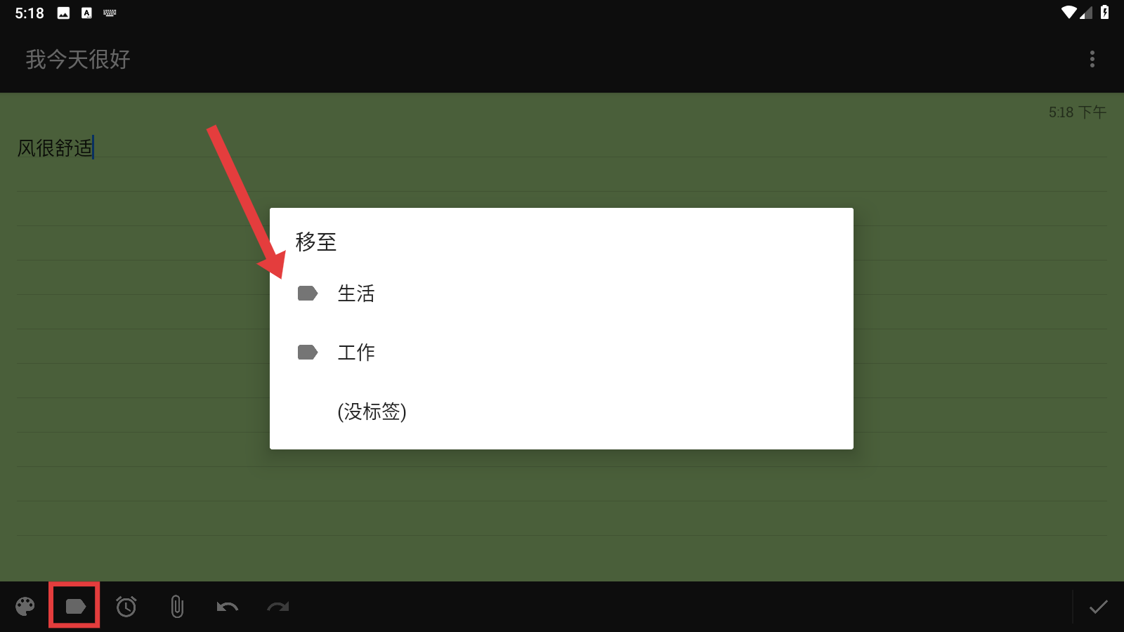 4、点击底部的标签按钮,在弹出的选项里选择【生活】标签,这样就能把笔记按分类整理好,方便之后查找啦。