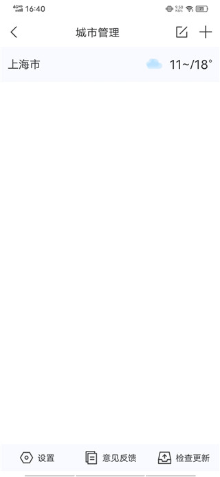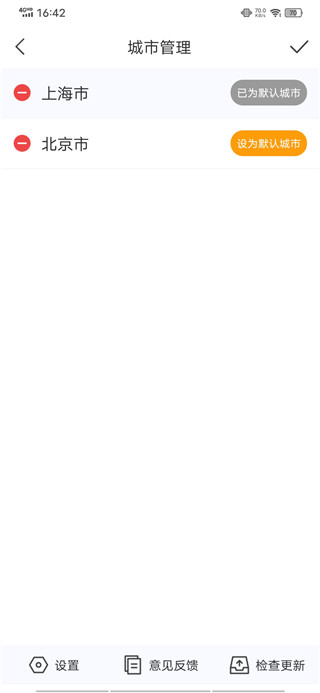 4完成添加操作后,可通过城市管理界面中加号按钮旁的编辑功能来设置默认城市,设置完成后,后续进入时系统会直接展示该默认城市的信息。