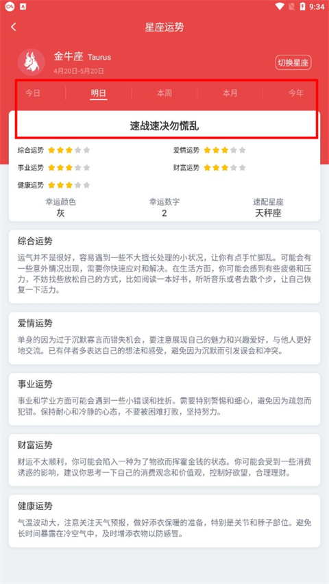 3接下来进入相应页面后,就能查看自身的整体运势情况,以及感情、工作等方面的运势走向了。