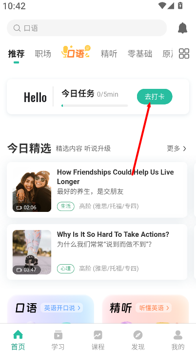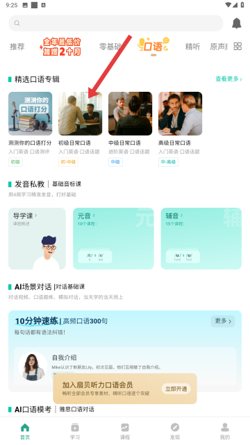 1打开软件后,直接点击顶部的【口语】板块,就能开启你的英语口语提升之旅啦。