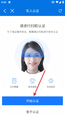 4、进入实人认证页面后,点击【开始认证】按钮,根据页面提示完成扫脸认证流程。