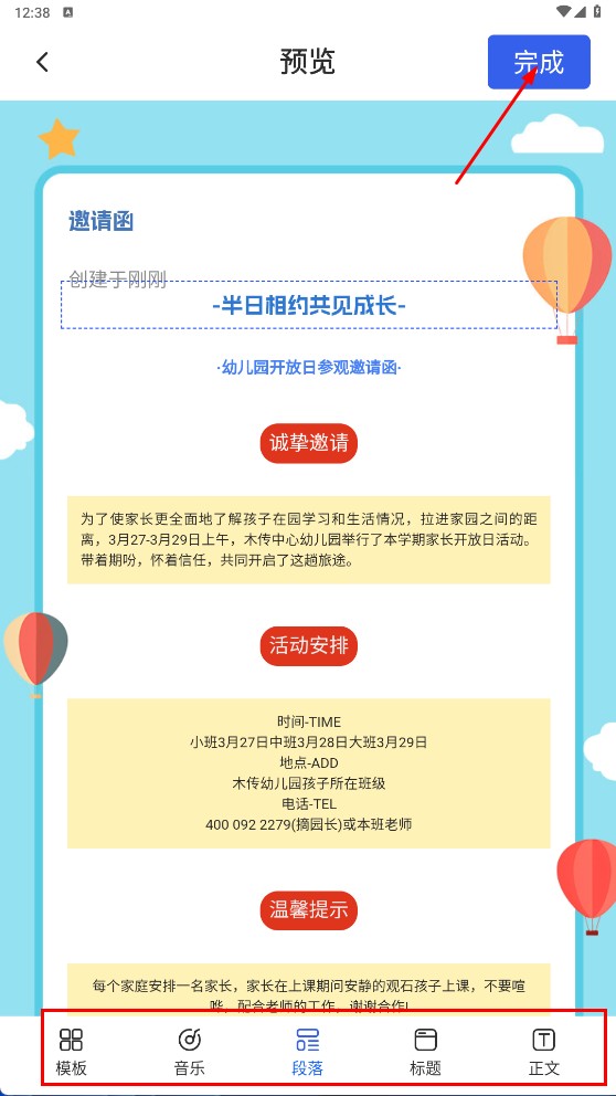 4在预览界面,借助底部的编辑功能调整内容,确认所有信息准确无误后,点击“完成”按钮,就能得到最终的邀请函文案。