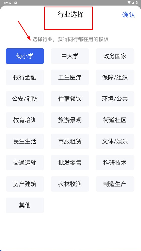 1在行业挑选界面,选定匹配的行业分类(例如幼小学领域),系统会呈现该行业适配的模板素材,点击确认按钮即可完成行业选定操作。