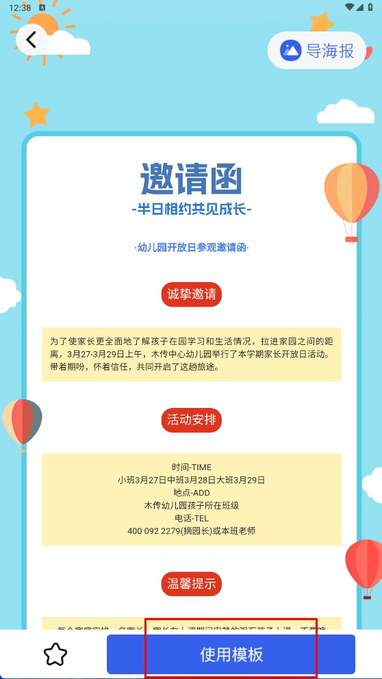 2、进入模板列表后,找到并选定目标模板(例如幼儿园开放日邀请函),点击【使用模板】按钮,即可进入编辑界面。