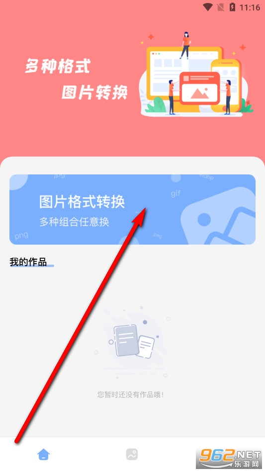 1在手机、电脑或模拟器上找到已安装的JPG改图宝应用并打开,进入主界面后,找到并点击【图片格式转换】功能选项。
