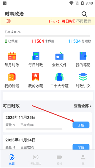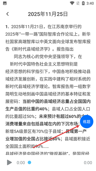 2、在时政内容页面点击【练题】按钮,即可进入对应日期的时政练题准备界面。