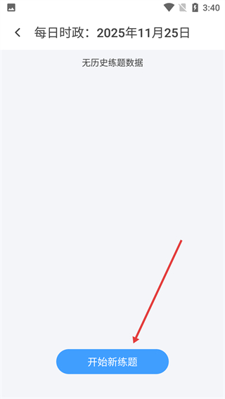 3、进入练题准备界面后,点击【开始新练题】按钮,即可启动对应日期的时政题目练习流程。