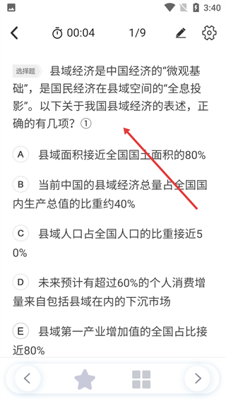 4、进入题目练习界面后,能查看题目内容并选择相应选项,完成时政题目的作答。