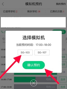 5、弹出“选择模拟机”的对话框后,先点击选择对应机型,接着点击“确认预约”按钮,之后在预定时间前往指定地点的模拟机处,即可进行练车学习。