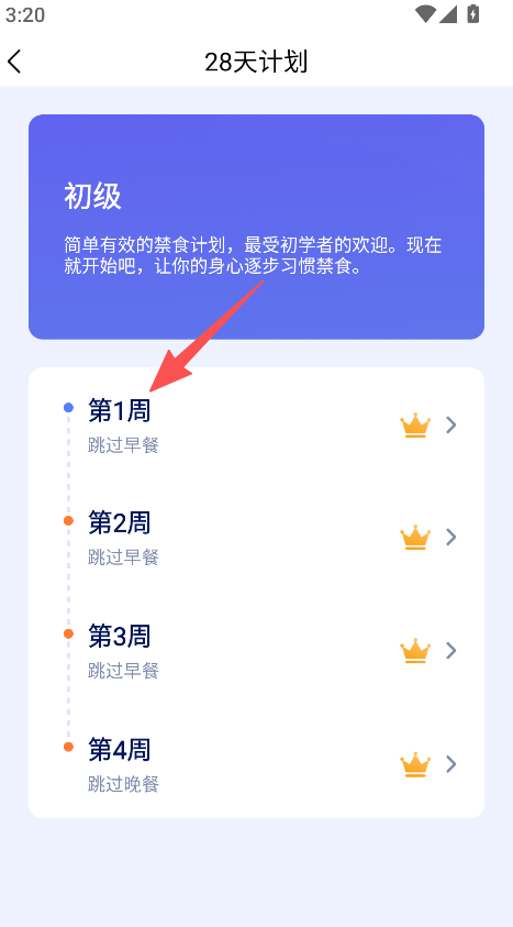 2、了解对应等级的每周具体规划(例如初级阶段第一周可略过早餐环节)。