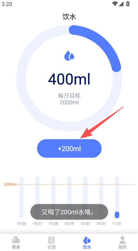 3进入饮水管理区域,通过点击对应按钮添加200毫升饮水量记录,以此来实现每日饮水目标的追踪与管理。
