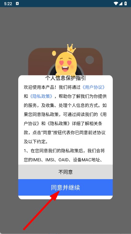 1、启动时光变老相机应用,待弹出提示窗口后,点击“同意并继续”按钮。